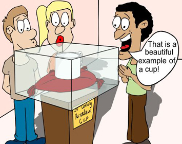 But notice in the above example the difference between the description (the cup is white) and the evaluation. The evaluation is nowhere in the cup. It occurs in our own head. The whole world could believe the cup was bad, and it would still be exactly the same cup. It would still be white. The whole world could believe the cup was good, and still it would not change.